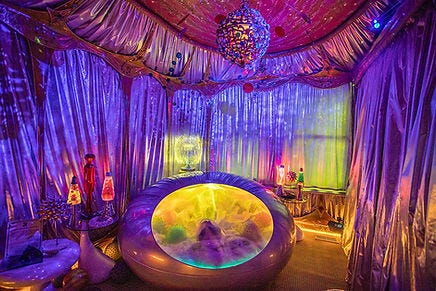 Visiting the Gregangelo Museum is kind of like viewing a house for rent…if that house was actually the inside of a kaleidoscope, and if that house viewing included group therapy with the other apartment hunters. The museum is, in fact, a private home owned by SF artist and performer Gregangelo Herrera. It’s unassuming from the outside, but once we entered the front “portal” (after answering a riddle), the interior exploded into psychedelic controlled chaos. We visited 7 rooms, each one with its own theme, filled with art and trinkets from all over the world.
