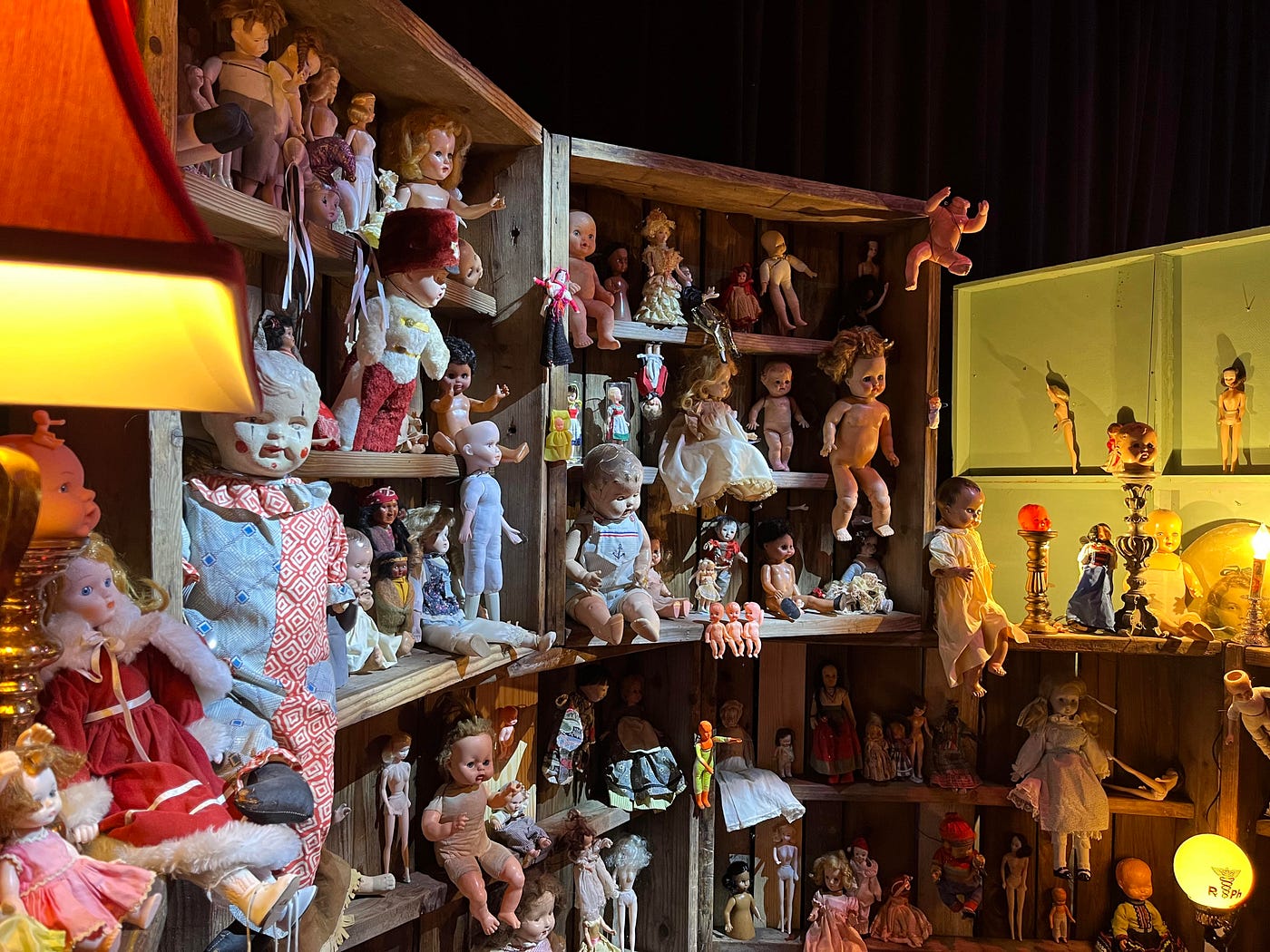 Four more rooms of snooping and discovery lie ahead of us — a gallery, a kitchen, a bedroom and a creepy attic filled with dolls. Each one offered more ephemera to touch, more artwork to look at, and more multimedia to engage with, such as old home movie footage playing on a TV, or the chance to listen to the artist’s answering machine messages. Opening the kitchen stove to find a tray of muffin cups filled with baby doll heads (a recurring theme throughout the installation) gave me big Meow Wolf House of Eternal Return vibes, while the hunt for hidden information pulled in my favorite elements of escape rooms: scavenging for clues and solving puzzles in order to progress the story.