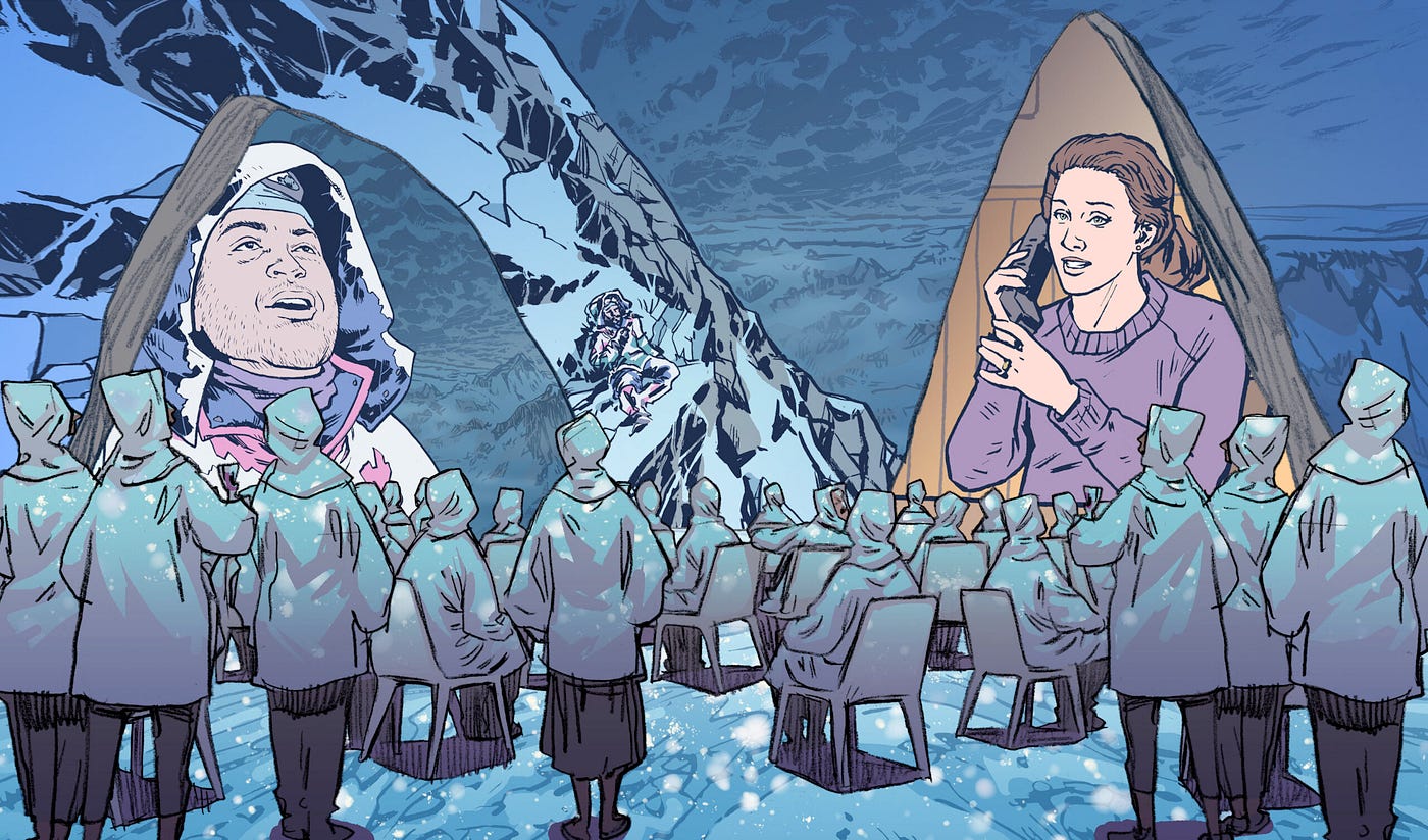 The experience bills itself as an “immersive graphic novel opera.” Upon entering the theater, you pass through “base camp,” and are handed a white sheet to wear to better blend with the floor to ceiling jagged mountain set. Then, comic-book style animated characters perform a (pre-recorded) opera, projected onto a 360 degree set with surround sound speakers.