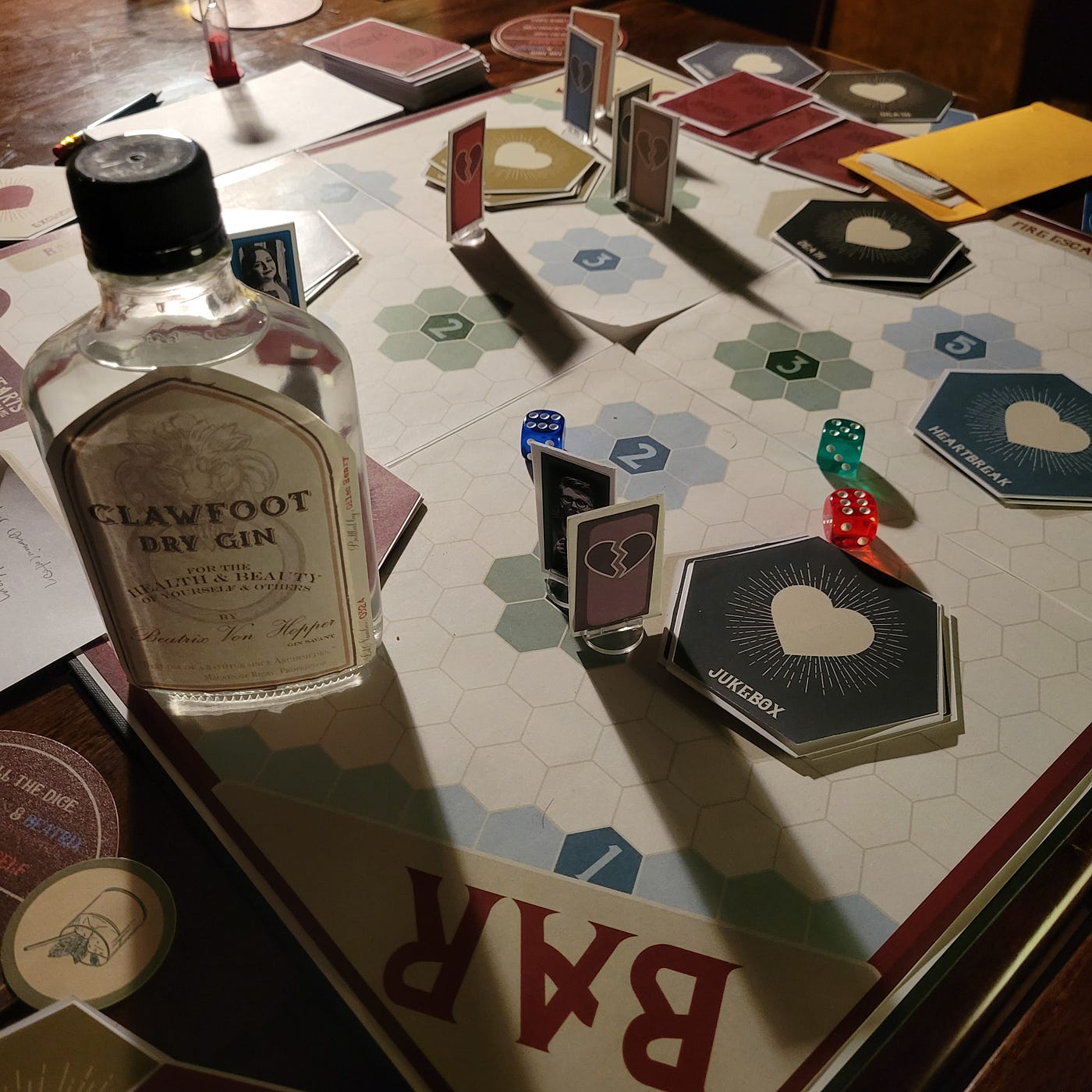 But the evening’s pièce de résistance is the board game itself. Audience members are randomly assigned a table, playing among strangers. The board is Clue-like, with the audience moving around the old bar drawing cards to answer open-ended, personal questions. While playing, the performers move between tables, partaking in the questions.