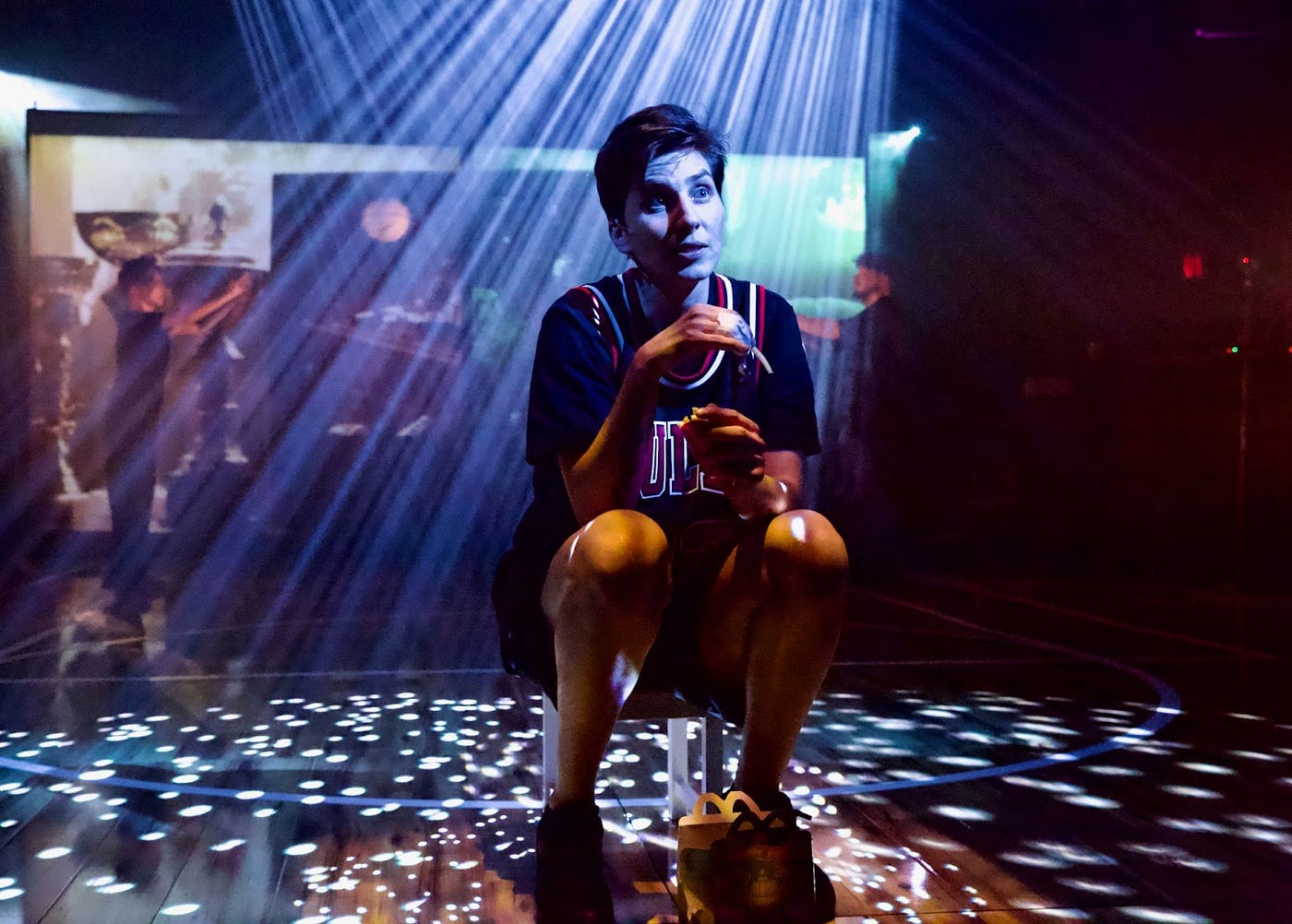 In this production, La Mama’s Ellen Stewart theatre is transformed into a basketball court complete with a basketball hoop, live cameras, and a real DJ on stage who live scores the performance each night (major shoutout to Blanka Barbara who keeps the energy high and the party going throughout the night). The piece tells the story of Snytsina’s experience being a prop in the government’s regime and how she decided to leave both basketball and her home country in protest. KS6 is emblematic of the group’s work, of course in it’s telling of a true story, and having Katsiaryna Snytsina herself play the titular role, but also in it’s maximilist approach to staging: BFT usually does simply too much on stage, and it’s always glorious to watch. This time around the audience is treated to a basketball filled with blood that sputters all over the floor when stabbed, a tiny suitcase outfitted to be its own little world, and a massive amount of bubbles amongst other antics on stage.