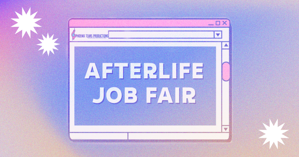 From Phoenix Tears Productions, Afterlife Job Fair is the fourth entry in their Posthumous Universe. Like each predecessor, it’s a Zoom based experience with audiences engaging in role playing and moving between Breakout rooms. In Afterlife, the audience are candidates looking for work, circumnavigating interviews and corporate espionage, the latter raising questions about these companies’ motivations.