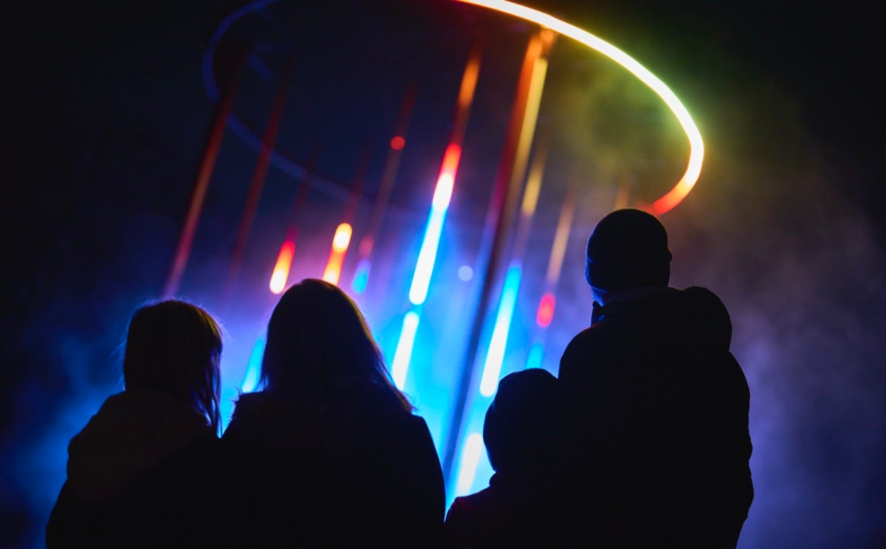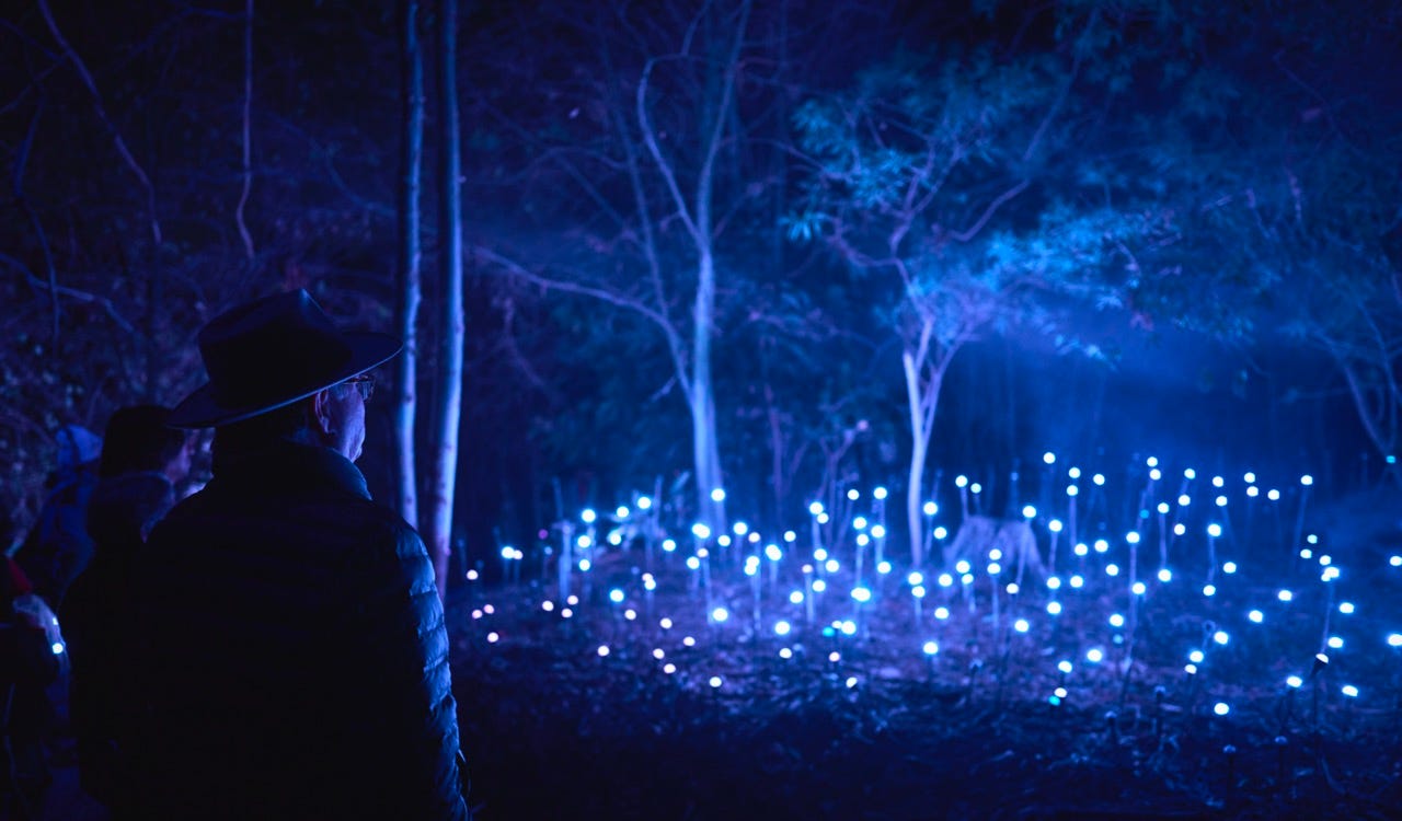 Nine installations are laid out on a pathway through the garden that tell a fable about the birth of stars. Some are large scale pieces of the kind you might encounter at Burning Man: sources of spectacle that mix dynamic light and sound into works that feel like they’re dispatches from another realty. Others are just pretty, and one feels like walking through the inside of a kaleidoscope by way of an enchanted laser forest.