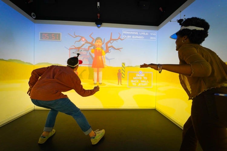 My group played Squid Games which consisted of six games, each with a completely different mechanic or task at hand, all modeled after actual games from the show. We played Red Light, Green Light where a motion detector sensed our movement whenever the spinning head of Younghee was facing us. Next we had to walk around the room to cut different shapes out of cookies. One game tested our memory, while another assessed our rhythm — all while moving around the room, and occasionally tapping the walls like buttons. The games were highly engaging and kept us laughing (and cursing) the entire time.