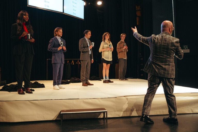 At the start, audience participants are guided through how to use their clickers to vote, but that’s about where any sort of onboarding or boundary setting stops. Lights remain on through most of the show so folks can see their clickers, understandably, but as the piece progressed, the lack of boundary setting and informality of the audience being lit made it much easier for audience members to begin interjecting their own comments to the room during their show. It’s very possible this is intentional, as the social contract of theatre is further disrupted later in the experience, but it was a bit awkward to navigate without the formal guidance of the piece itself. This did not ruin the piece in the slightest, but rather added an intriguing layer of audience/voter behavior to the overall questions the piece was asking.