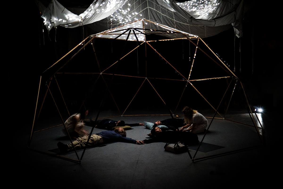 Abide is an ongoing immersive installation utilizing live instrumentation, performance and generative artforms to explore entropy and nonduality. Through sensory and auditory immersion performers discard binary structure inviting audience members into their own attempt at a shift in perceptual structure. Musicians and artists perform together creating a space where attendees, alongside performers, can collectively foster an objectless awareness, experiencing a kenotic self-emptying outpouring.