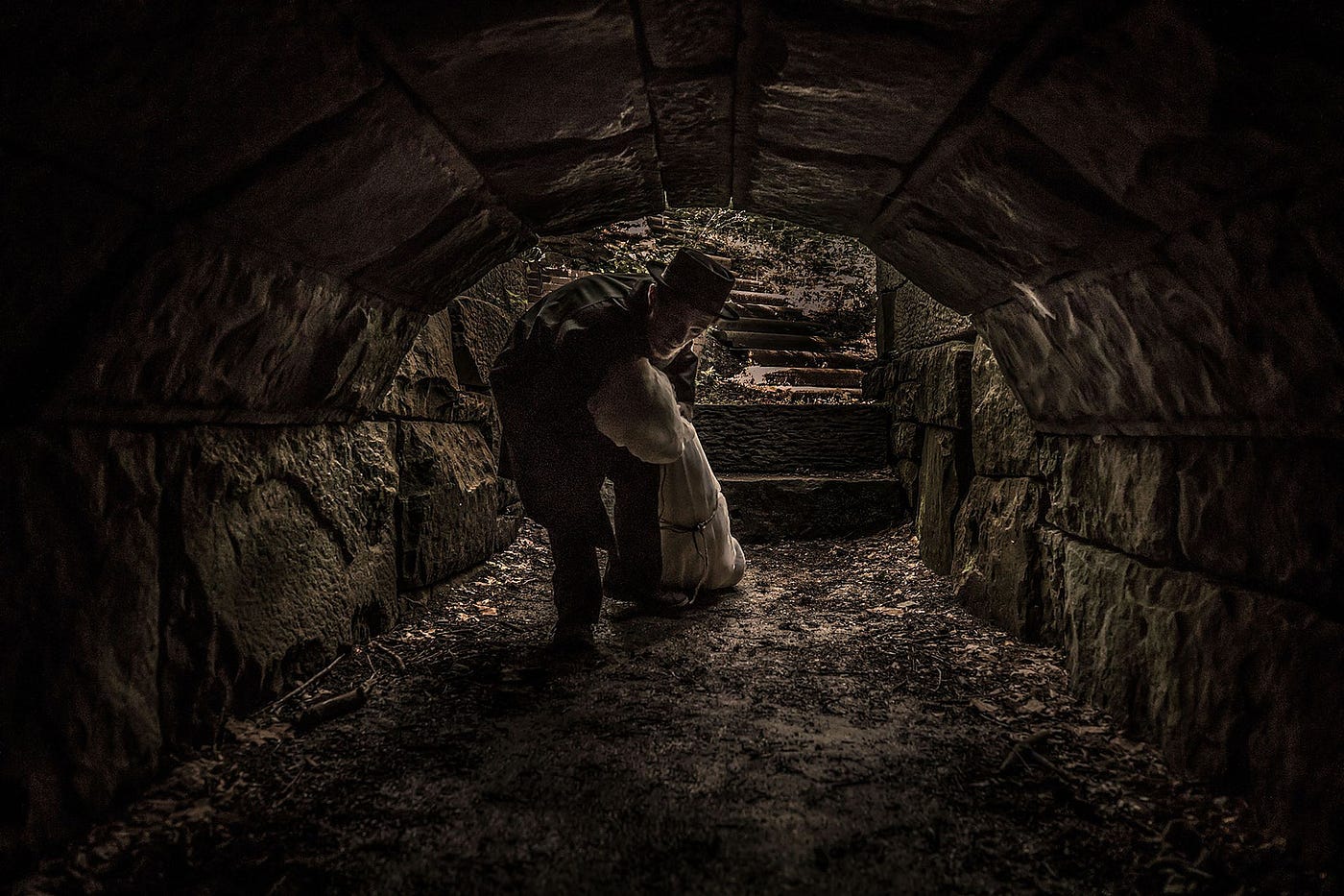 This piece embodies some of the best aspects of the intersection between Site Specific and Immersive work. Basing the larger narrative in a historic series of murders of the 1930’s which thrust Elliot Ness into fame, there will be many possibilities for future locations around the Cleveland area. But beginning in Bedford added a quaintly eerie, almost sepia quality to the entire experience. When the old musty smell of the basement of the Historic Society hits you as you walk down those stairs, it adds an authenticity that most immersive theatre wishes it would have. In addition to the blessing of the physical spaces, all other design elements worked in excellent consort, even during the ride to the Aqueduct, the sound design there filled in so many of the larger narrative points, I wish it were a little bit longer so we could get more details. All of this being said about the physical production, the embodiment of every character whom you encounter has a lived in familiarity. Whether awkward, longing, creepy, or hopeful, the shift in gears of the pacing of scenes successfully ratchets up the tension until the reveal at the end. Some of the strongest performances on my tracks included the aloof drink concocting doctor, the optimistic young typesetter at the print shop, and Lily herself. As this is many cast members’ first time working in immersive theatre (as was explained to me post show), Wanderlust has found a treasure trove of excellent performers with which to build a company.