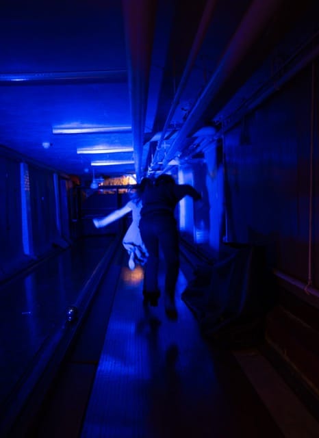 Most of the scenes in Sheffield Scientific are movement-based. Dance, touch, and play show us who the characters are and what haunts them. In one scene early in our journey, the Daughter stands up and playfully tosses a paper airplane across a dining table at the Housewife. With a grin, the Housewife tosses a plane back. The Daughter enlists the help of the audience, and soon flying paper airplanes fill the dining room. Then, suddenly, the Housewife, played with a palpable, distant pain by Abigail Murphy, seems suddenly overwhelmed. She falls down in her seat, against a wall. The planes are a great time, until you remember that planes drop bombs, and then you remember that the world has ended, and then even the sweetest memories open up to darkness.