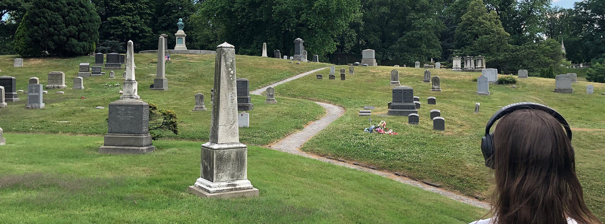 Another opportunity with the medium of podplays is to weave the details from the environment into a story. As we moved through the cemetery, Cairns led us to various graves and told a brief history of the people buried there. We met Do-Hum-Me, an indigenous woman from the Sauk Tribe who died a few weeks after coming to New York and performing in P. T. Barnum’s “infamously racist and extremely popular America Museum.” We learned about Eunice Foote, a scientist in the mid 19th-century who conducted research that informed early discoveries about global warming.