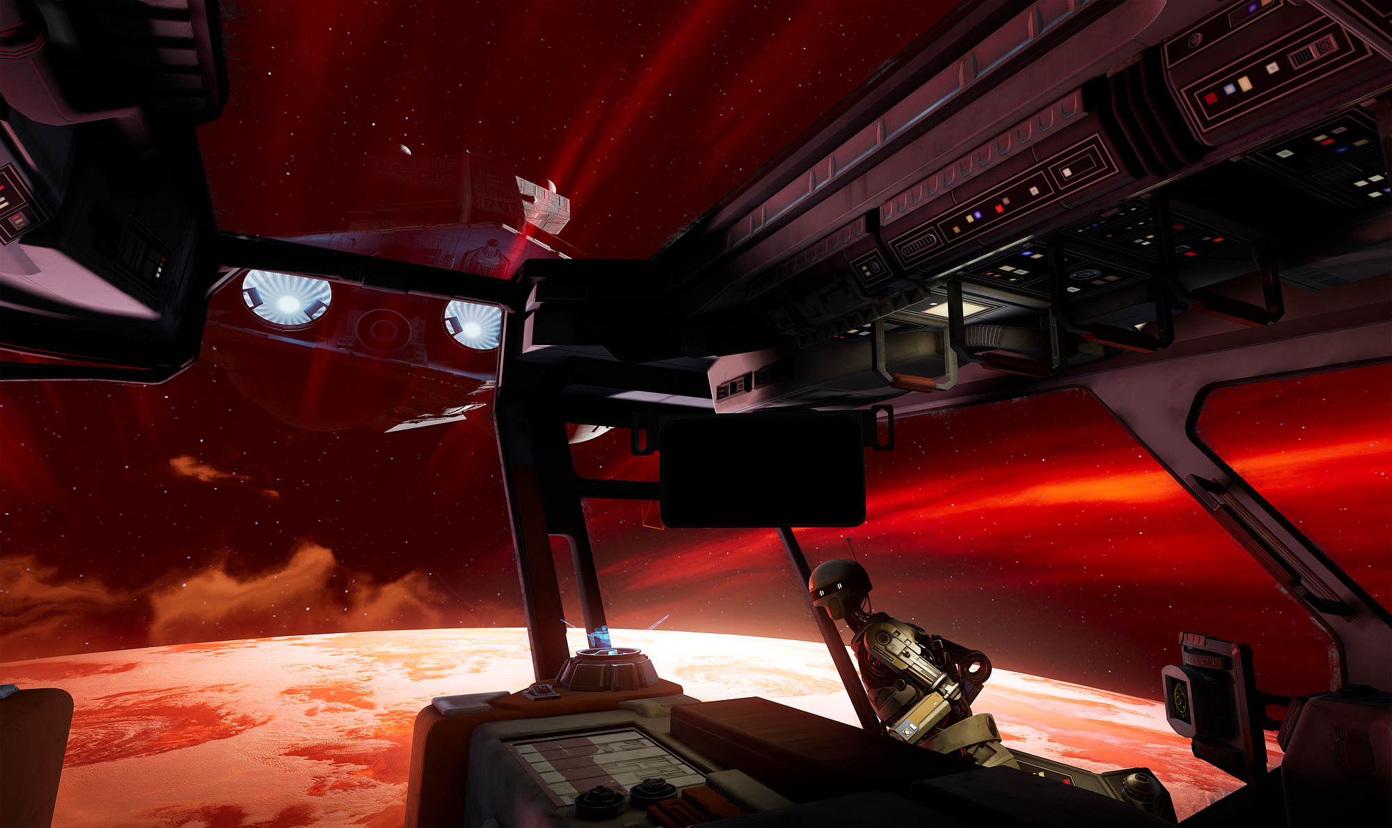 Part of the initial appeal of Star Wars when it first appeared in the culture is that it presented a view of a futuristic society that had a “lived in” look. Gone was the shiny silver spaceship aesthetic of 50’s sci-fi, replaced by the recognizably Middle-American bucket of bolts that was the Millennium Falcon. Comfortable messes held together with ingenuity and chewing gum is the mood, and that’s exactly what you walk into on your ship. Poke around and you’ll find mementos of adventures past that ZO-E3 comments on, turning what would be a lore-packed loot screen in a roleplaying game into a spot into a place that feels like home for your alter ego.