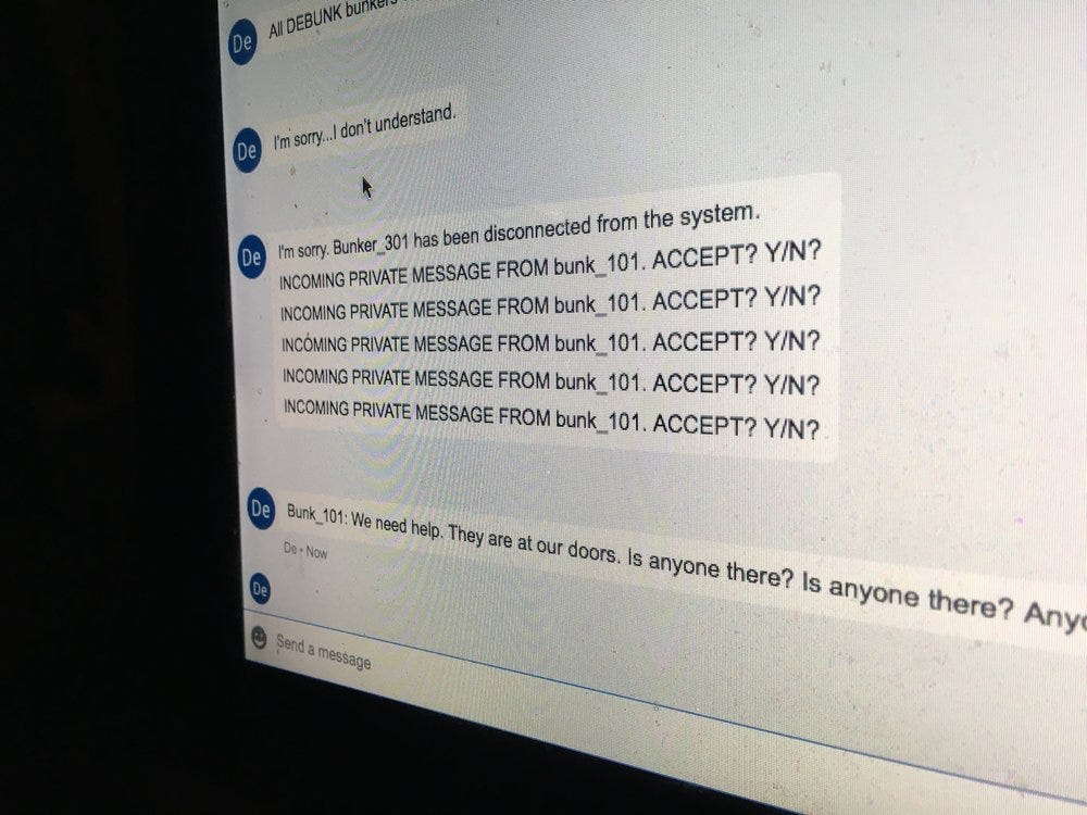 Our sci-fi choose your own adventure, The Bunker, is like the ultimate one shot D&D session: Groups of 15 make decisions that procedurally build reactive, dynamic stories and culminate in a one-of-a-kind epilogue. After a year and a half, no two endings have ever been the same.