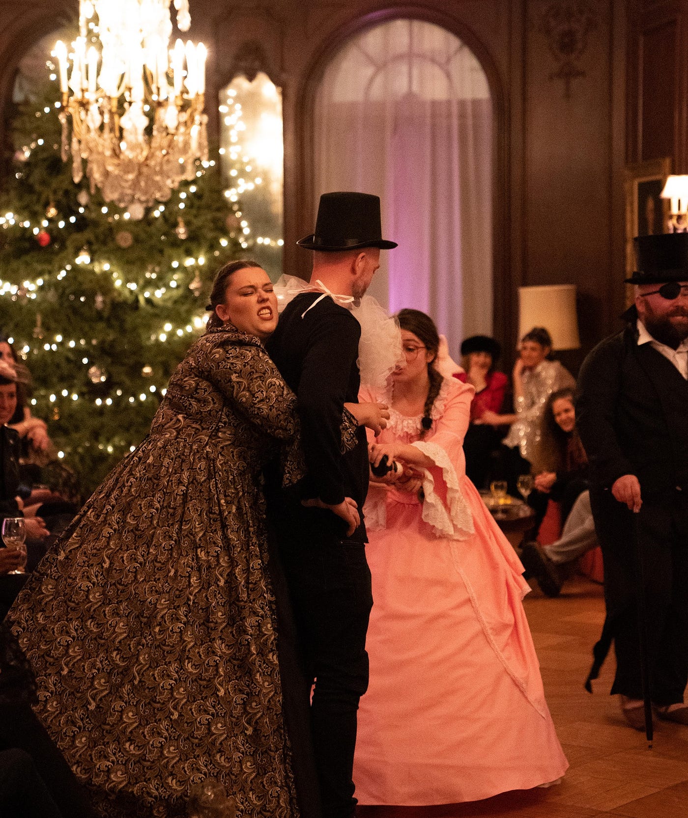 The Immersive Nutcracker Cocktail Fête is pure entertainment. The piece has succeeded in creating an experience that allows audience members to get silly and lean into the absurdity and spectacle-like nature of the world without depending on them to complete it. Straddling the line between immersive and participatory theatre has created a structure that works really well while taking the pressure off the audience to actually “perform.” Yes, we did get up on stage, but the actual performers were so much more ridiculous and farcical than the audience participants that it would be hard to feel embarrassed of your own performance while standing next to them. Shifting the spotlight in this way kept the piece from scaring participants off, and the incredible fun the performers were having on stage abated any severe shyness or stage fright in the room. The combination of the jolly performance with playing dress up in fancy costume pieces in addition to the flowing drinks created the perfect circumstances for a night full of pure fun. We had such a blast at The Immersive Nutcracker Cocktail Fête, I truly don’t remember the last time I laughed so much at a show. I wouldn’t recommend attending if you’re looking for something to sink your philosophical or intellectual teeth into, but really who goes to a fête for the deep and meaningful conversation? If you’re looking for a silly but well-crafted night out with some friends, The Immersive Nutcracker Cocktail Fête is a winner, hands down.