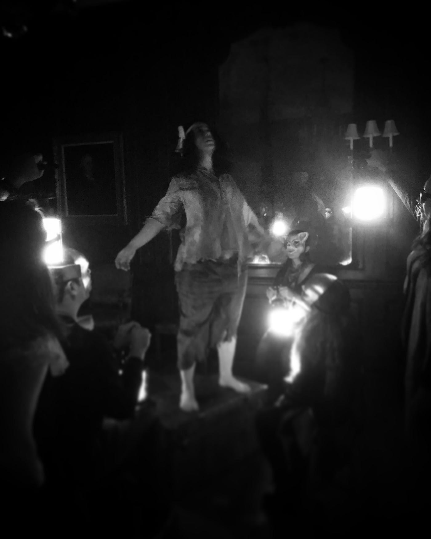 The audience “casting” was also an inspired choice; each audience member gets an item, some of which you might half-remember from high school English class. These items are also paired with their private audio tracks (and therefore storylines and instructions unique to each audience member.) The mystery of the evening reveals itself as determining “who” you are in the story world, and exactly how much blood you have on your hands. It’s a great hook that quickly worked at pulling me into the story. The production then alternates between opportunities to search the darkened mansion for clues about your identity, lantern in hand, and scenes with Scott as Poe hinting at your dark past.