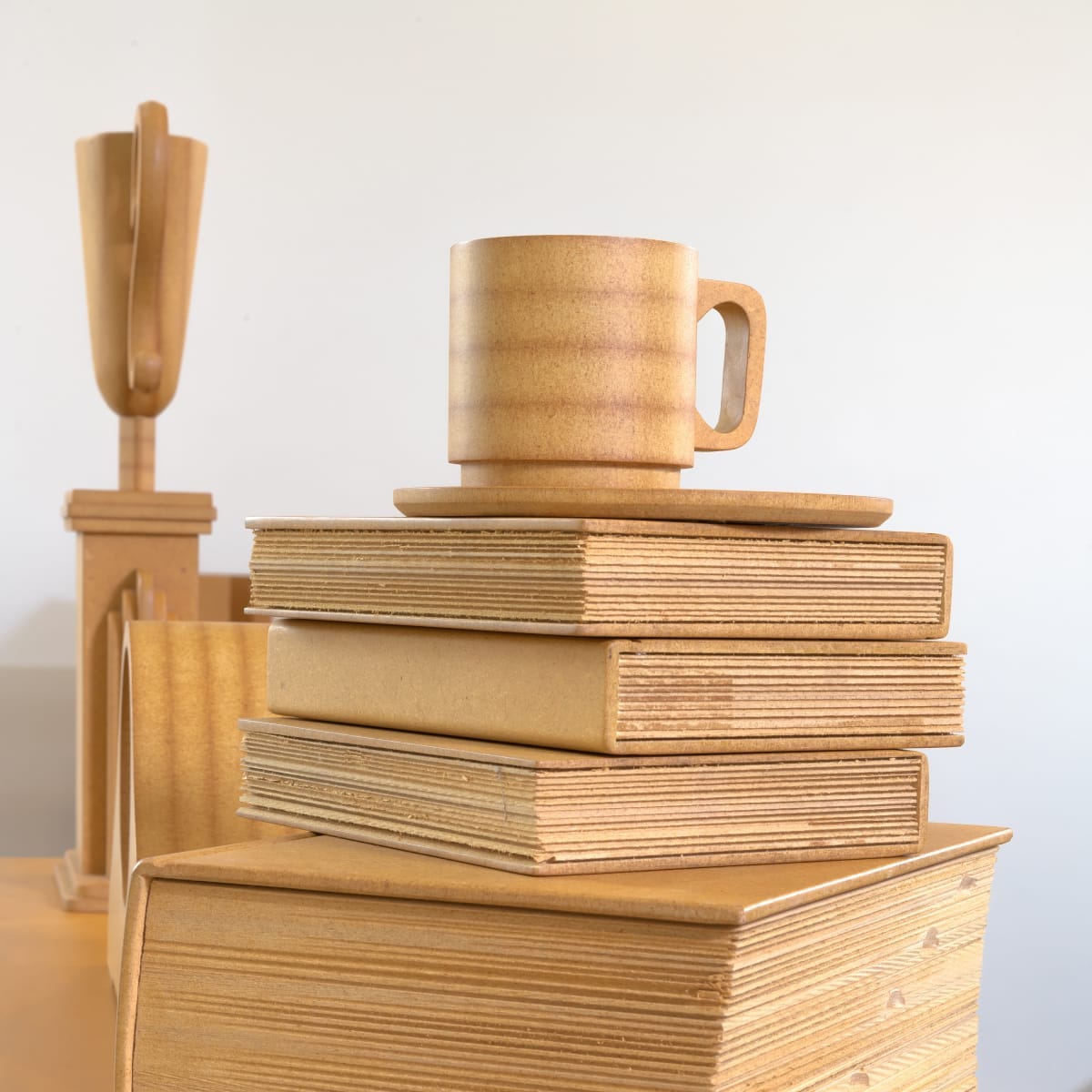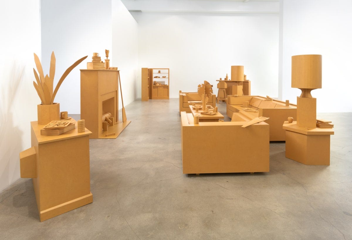 Originally constructed in 1978, the uniformity of this industrial material creates an odd, visceral desire to touch everything; there’s a tactile vibration to the particleboard. Its embodiment is both flat and dynamic. Walking through the installation feels like stepping onto a theatrical stage. The furniture and objects seem temporary, like stand-ins. There’s a tension, a sensation that a rehearsal was interrupted midway through Act II, and now, with the story unfinished, the viewer becomes a type of forensic investigator. The sculpture’s medium adds a surreal layer to this detective work: everything stands out because everything’s the same.