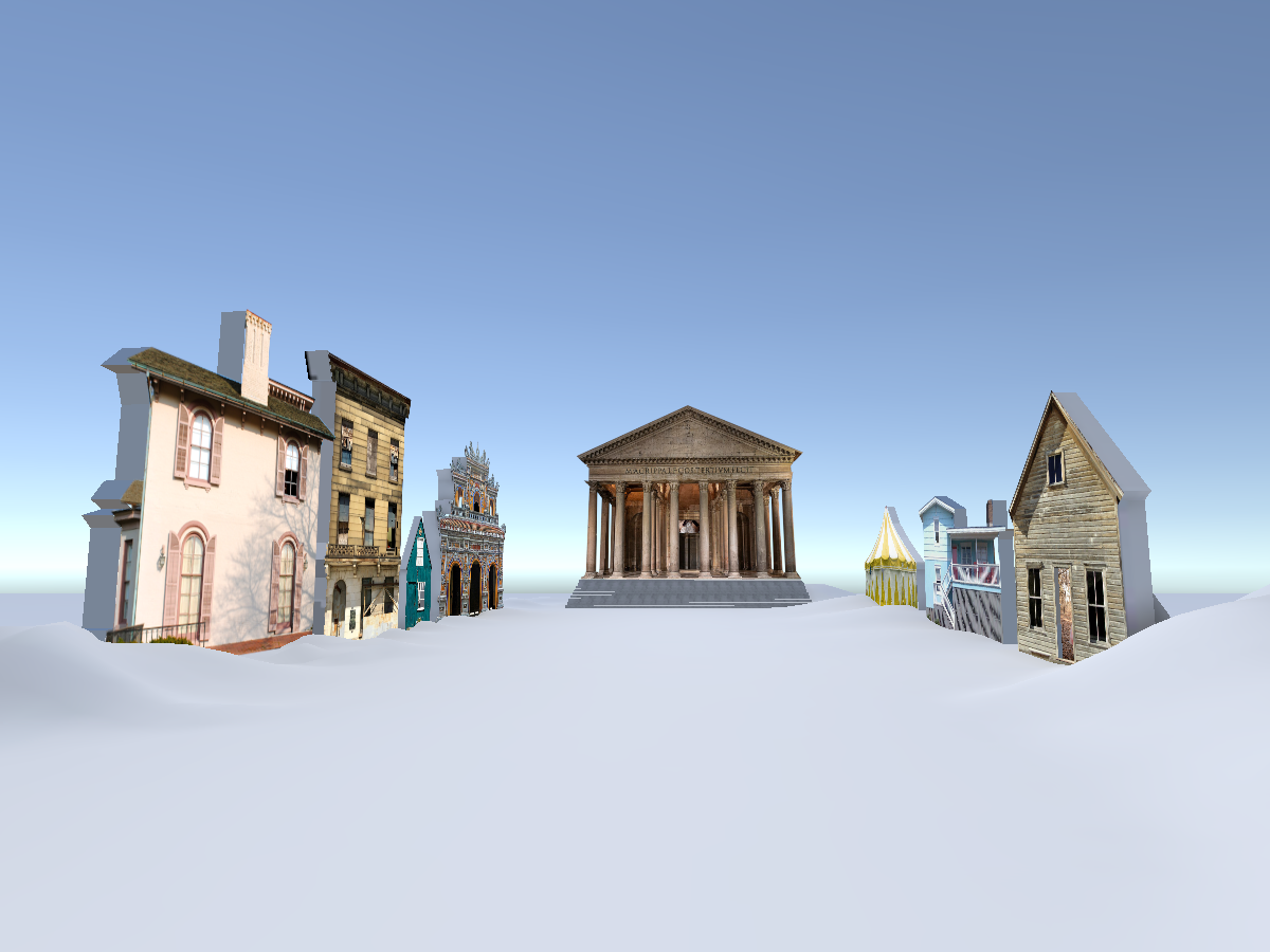 The creators play with the concept of “facade,” first with the avatars and then with the main gallery space which manifests as a “town” made up of movie set style structures, complete with support struts holding them up from behind. It’s provocative details like that which elevate the act of VR worldbuilding into Art. The one real trick: it’s possible that someone might miss out on the centerpiece, as the door which leads to the installation is directly behind the spawn-in point of the avatar gallery, and I can imagine someone popping in, trying on a few avatars, and thinking that’s all there is to it. Just remember that curiosity is rewarded.