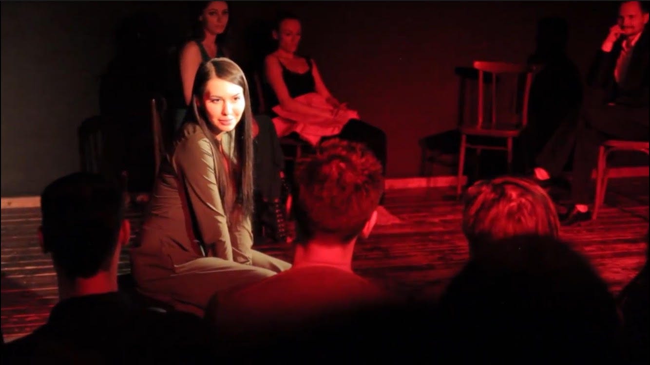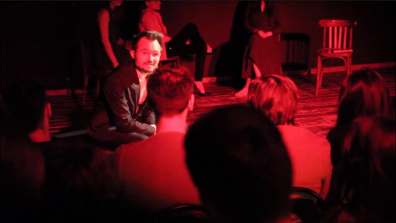 Beyond this, there was no consent to when or how an audience member could engage with these questions. Actors chose who they wished to question by simply scanning the audience and picking whoever they felt like addressing out of the crowd. Typically, I am the first to want to engage with an experience, as someone who keeps eye contact with performers, and waits for that outstretched hand or wink of the eye from a character as a cue to engage. But in this scenario, I struggled and felt more like I was being forced to participate in an icebreaker exercise among strangers. For the first time since high school, I found myself avoiding eye contact like an unprepared student in class, quietly praying that I didn’t get picked.