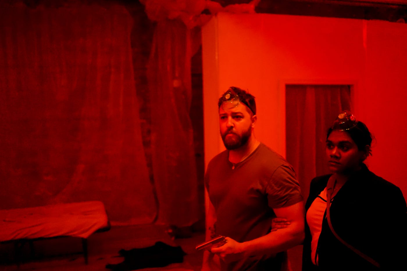 Thus as the storm rages outside the isolated base, the inside begins to meltdown. A hardcore psychologist, played by Isuri Wijesundara, struggles to keep her program alive and its structure in place as her female identity, race identity, and place of power. These personal foundations are constantly challenged, undermined, and jolted by her unraveling scientist colleague named Alex, portrayed tenderly and frightfully humanely by Lee Collins. Don’t be fooled, as Wijesundara’s character, Nadia, is causing her own share of chaos. Wielding sexuality, mental prowess, and firearms against Alex and her trainees to her own ends in the physical and mental Hunger Games-like environment that Nadia has helped to create.