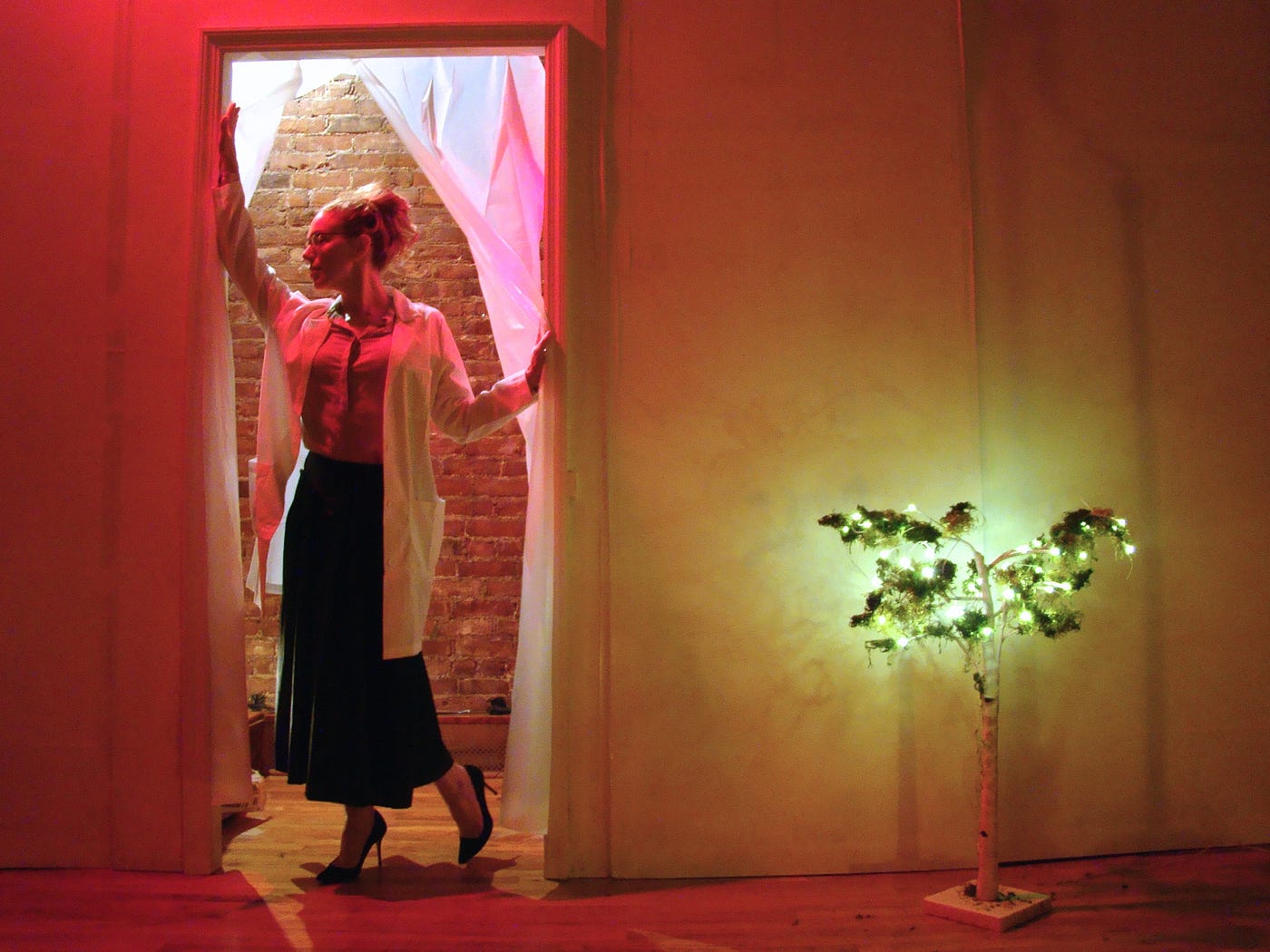 The Parlour’s art gallery is a wide open-floor environment, but there is a wonderful door in the far corner of the space. When this threshold opens, it’s as if a deep yawn reveals two steep steps that bring you fully into an intimate playspace. To the left of the entrance door, long strips of plastic that range from clear to hauntingly opaque dangle from the walls behind the small platform and drape from the balcony and staircase on the opposite side of the room. They rustle and wave slightly as the audience situates themselves into rows of chairs facing the platform, evoking a clinical and dystopian aura.