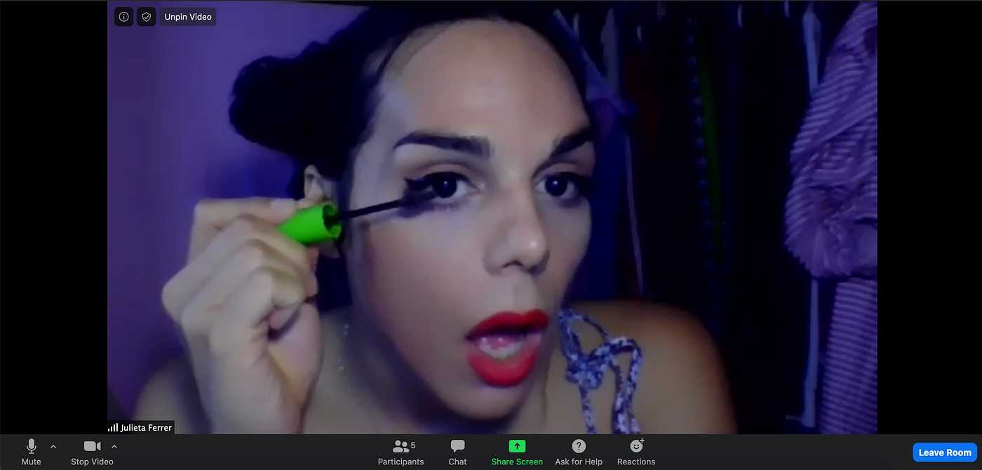 Content-wise, the stories in Long Distance Affair are all over the map, wandering from a porn addiction to an unrequited crush to previously mentioned eyelash tutorial. Generally speaking, though, the performances are all energetic and compelling, as the actors are fairly adept at reaching through tiny screens and connecting with audience members. The characters of Long Distance Affair don’t seem related other than they’re isolating somewhere in a far flung corner of the world; the closest common thread is a sense of surreality. In “London,” my companion mentions something about escaping flooding and hints at a post-apocalyptic future where you get around only using boats. In “NYC,” the character drops hints about his father, Mars, and his mother, Venus and speaks forlornly about love. In “Miami,” makeup instructor Julieta makes it clear she does not want to talk about her boyfriend, Romeo, or their two families who happen to be feuding at the moment. And in “Madrid,” Ángel discusses a very important message he has for me, specifically, from God. The other two encounters (“Paris” and “Singapore”) are more mundane and center around a socially-distanced birthday party and school bullying; somehow they lack the magic that the other four conjure up by being too close to real life at the moment.