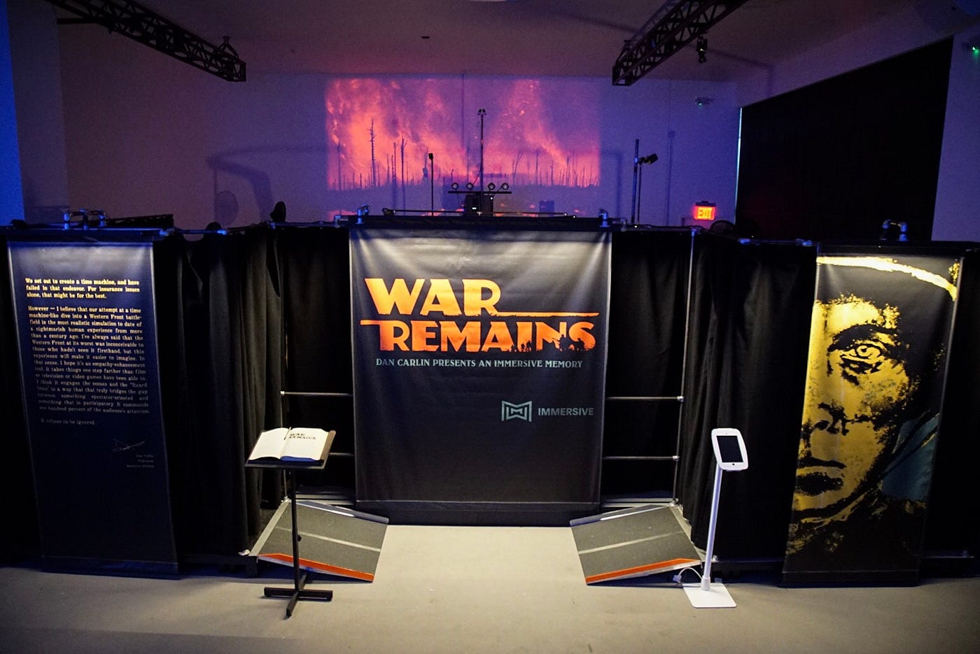 War Remains, presented by Dan Carlin, is a multi-sensory free-roam VR experience where participants can put on a VR headset, headphones, and backpack, and explore a real-life set that measures 25 by 25 feet. The piece is meant to be a “time machine-like dive” into the Western Front of WWI. War Remains is directed by Brandon Oldenburg, and produced by MWM Immersive with development by Flight School Studio and audio design by Skywalker Sound.