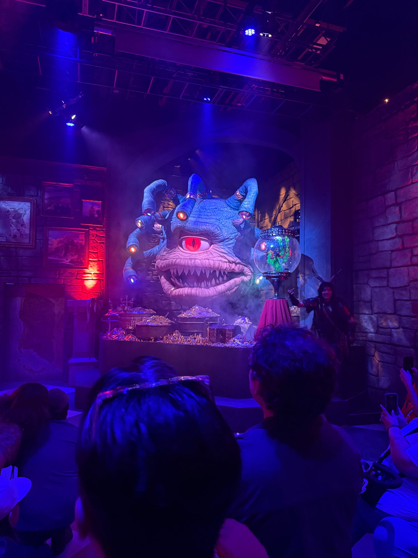 The big payoff for all of it is the encounter with the giant crime boss Xanathar the Beholder — one of D&D’s poster boy monsters who is realized as a great big beautiful animatronic. (Update day of publication: He’s actually a puppet! With a live puppetter! Even better.) He’s beyond fantastic, although he’s also hidden in a really obvious way when you walk into his room. That said: Xanathar the Beholder is what I imagine the designers at Knott’s are dreaming of when they make their big end-of-haunt maze creatures. I hope he is preserved with care and gets featured again.