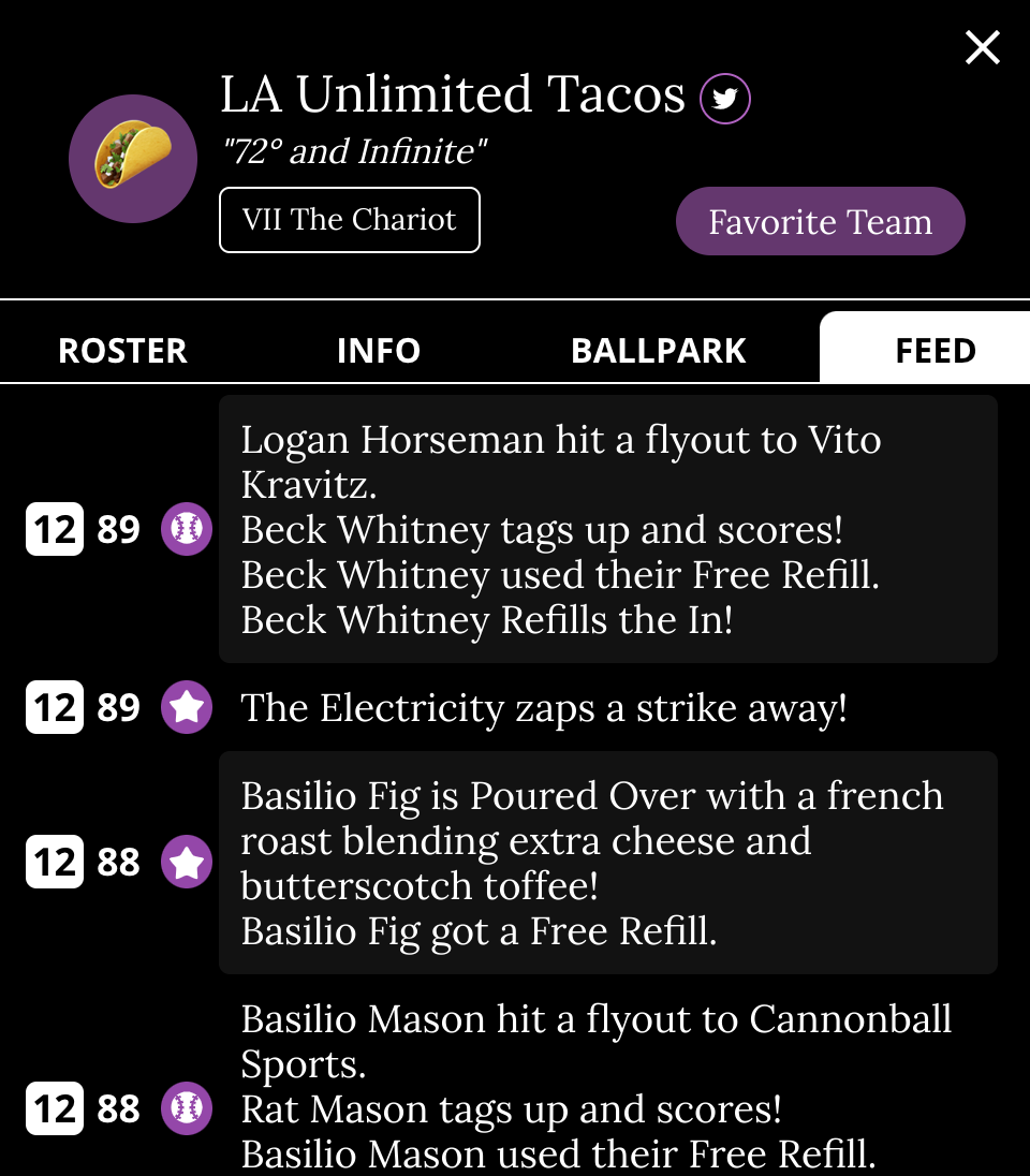 Some people have taken it further and run Twitter accounts where they roleplay as the different players or social media managers for all of the teams. They add color and build more off the work The Game Band has done while also being completely optional. If you only want to engage with Blaseball through the simulation and the website, you can do that. If you want to learn more about a few of the players on your favorite team, you can do that too. If you want to consume every page of the Blaseball wiki to understand the sprawling stories of the hundreds of players in the league, you guessed it, you can do that too. So, if you’re into the RP side of immersive entertainment, you can just hang out in the Blaseball world, soaking in the stories that people tell about the sport, or you can start creating your own.