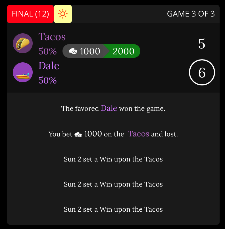 Fans (used to differentiate between the real humans participating in Blaseball and the players who play Blaseball) are mainly able to “play” by betting on games to earn coins. Coins can be used to purchase upgrades or votes. Votes can then be used to vote on Decrees, Wills, and Blessings that all affect the way Blaseball is played in various ways. Decrees tend to be substantial league-wide changes, while Blessings and Wills are team and player focused. I’d be remiss at this point not to mention that the game, despite all the betting mechanics, is completely free. There is a Patreon available to support The Game Band’s development of Blaseball though!