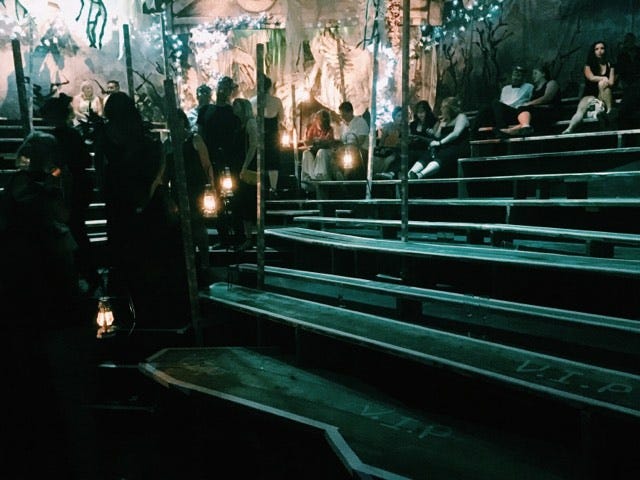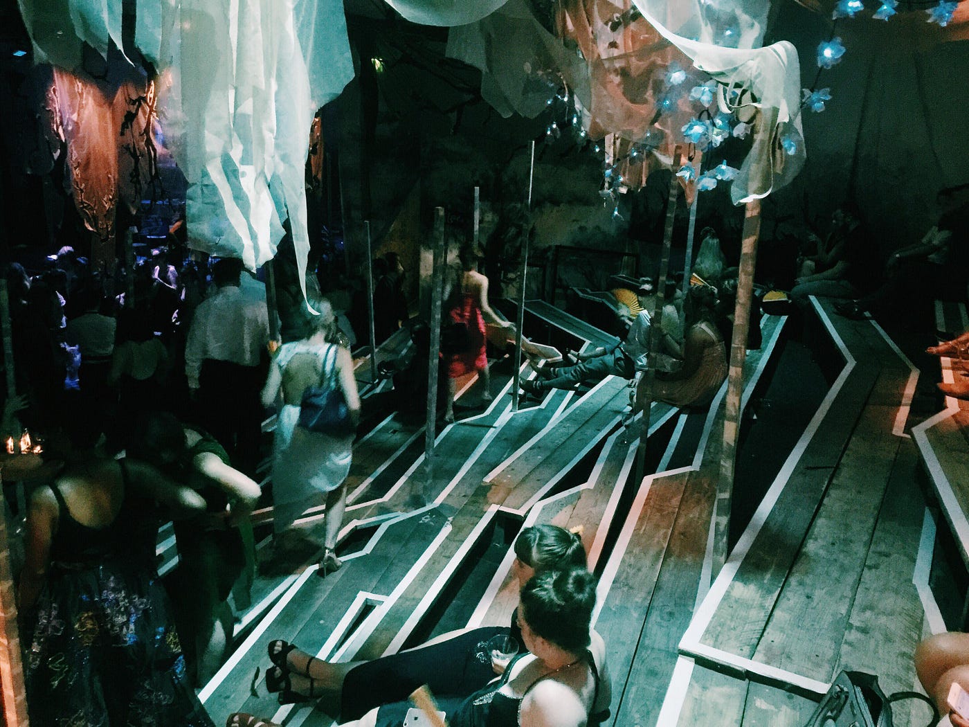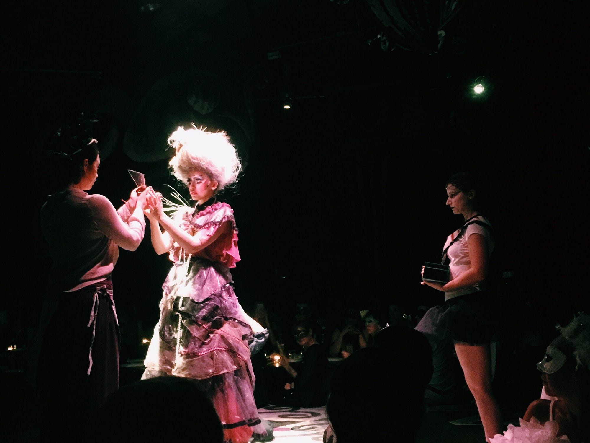 A clown in drag welcomes me, and takes me towards a raised platform in the middle of the space. Surrounding the platform are long wooden tables and benches, where guests are placed. I am getting vibes reminiscent of The Great Comet. I make acquaintances with the people on either side of me to as a I clamber onto the wooden bench. We discuss some other staples of British immersive theatre, like the work of Secret Cinema and Punchdrunk. It is clear that I am in good company, as it would seem that all fans of the medium in London have been ushered here.