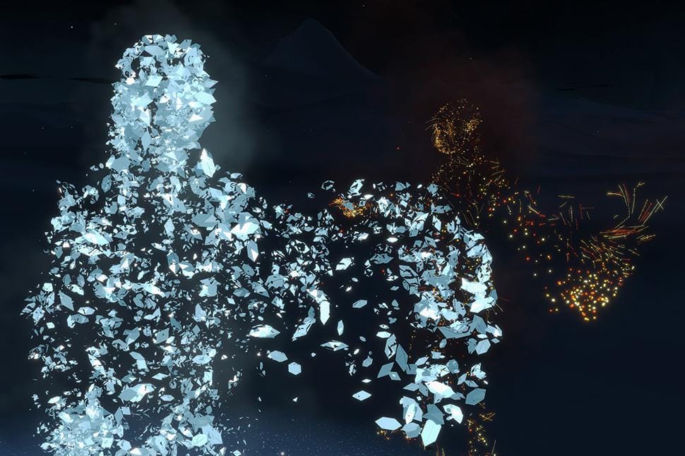 Movement and dance-based VR piece, Collective Body begins as a solo journey, easing participants into interaction with simple visual cues and intuitive motion prompts. Only later are we introduced to the presence of others: three fellow participants, each depicted in an abstract elemental form.