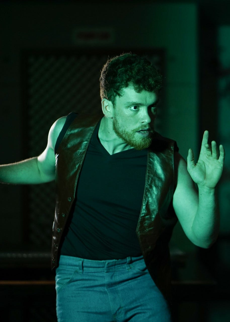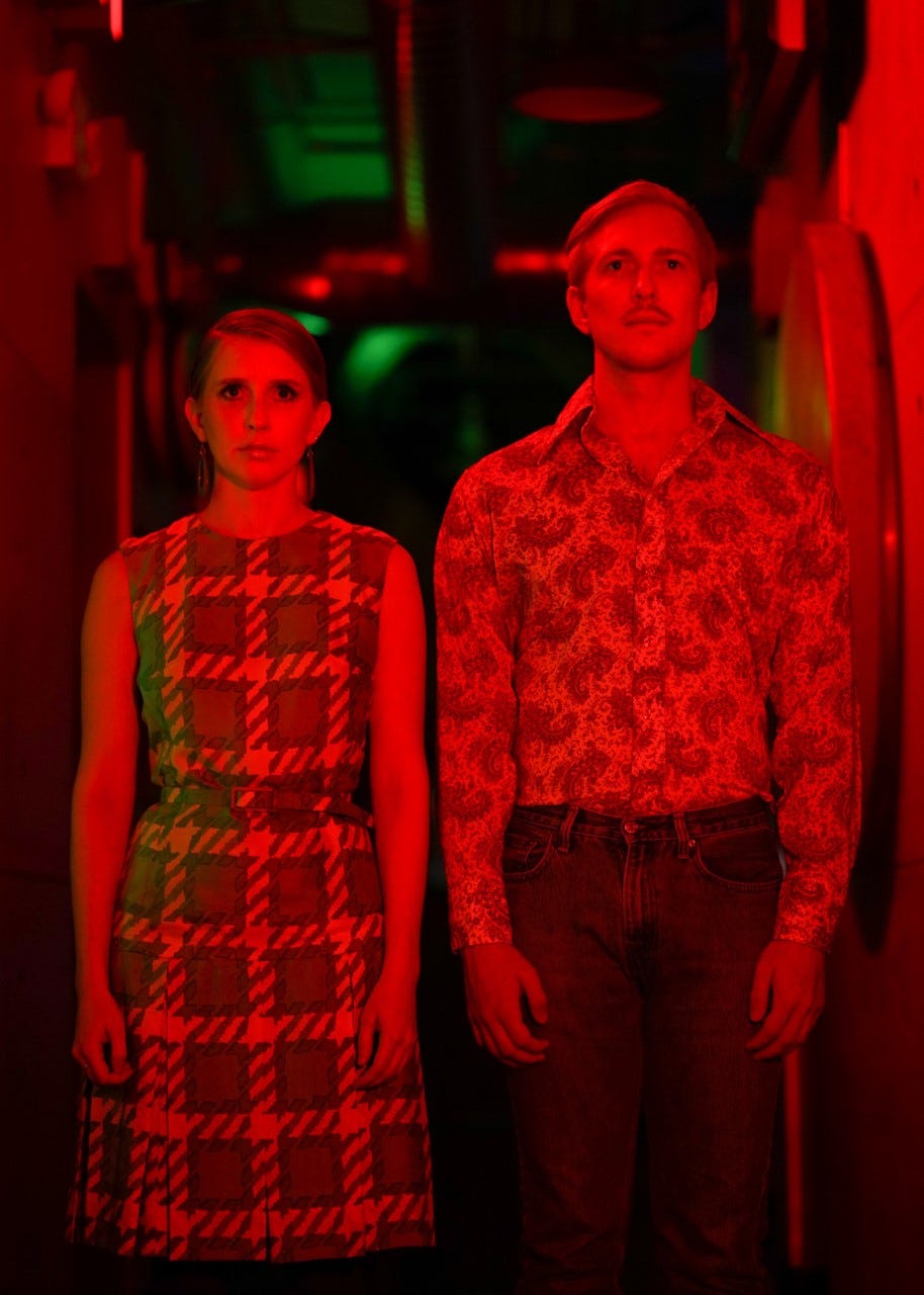 Fast forward to heading down the stairs, as we prepare to enter the show. The metal door in front of us slides open, untouched, with a loud bang. Two actors — who look oddly alike — get instantly coded in my eyes as twins. They whisper conspiratorially with their backs turned to us, near the middle of an improbably long hallway, washed in blinding neon.