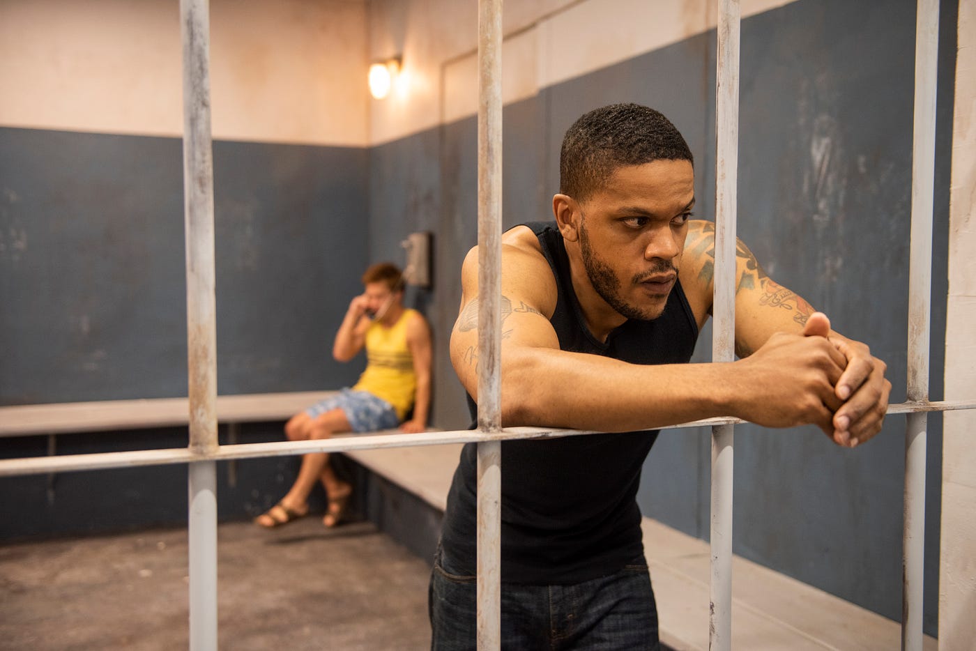 After running out of beer, Aaron makes a run to the store and gets pulled over due to a broken tail light and then arrested for unpaid parking tickets, earning himself a trip to the drunk tank. The audience finds itself under buzzing lights hung from the ceiling where the plastic covering the lights is slowly falling apart. I lean against the hard cinder block wall, which cools me as I begin to sweat in the hot temperature of the drunk tank. I avoid another person who we soon learn is Dwight (Brian Keys). (Iskinder stays behind on the sunny deck.) The performers acknowledge out loud that they are alone in the holding cell, forcing the role of the audience to be ghosts rather than others locked up in the drunk tank as well. We silently observe as Aaron cuts a deal with Dwight: Aaron’s father will provide Dwight legal counsel for parole if Dwight keeps Aaron safe while locked up. Yet, in transferring to the dark and cramped county jail, Aaron realizes he got more than he bargained for in his exchange with Dwight, and goes back on his promise, electing to leave Dwight locked up and tell a different version of events to Iskinder when released.