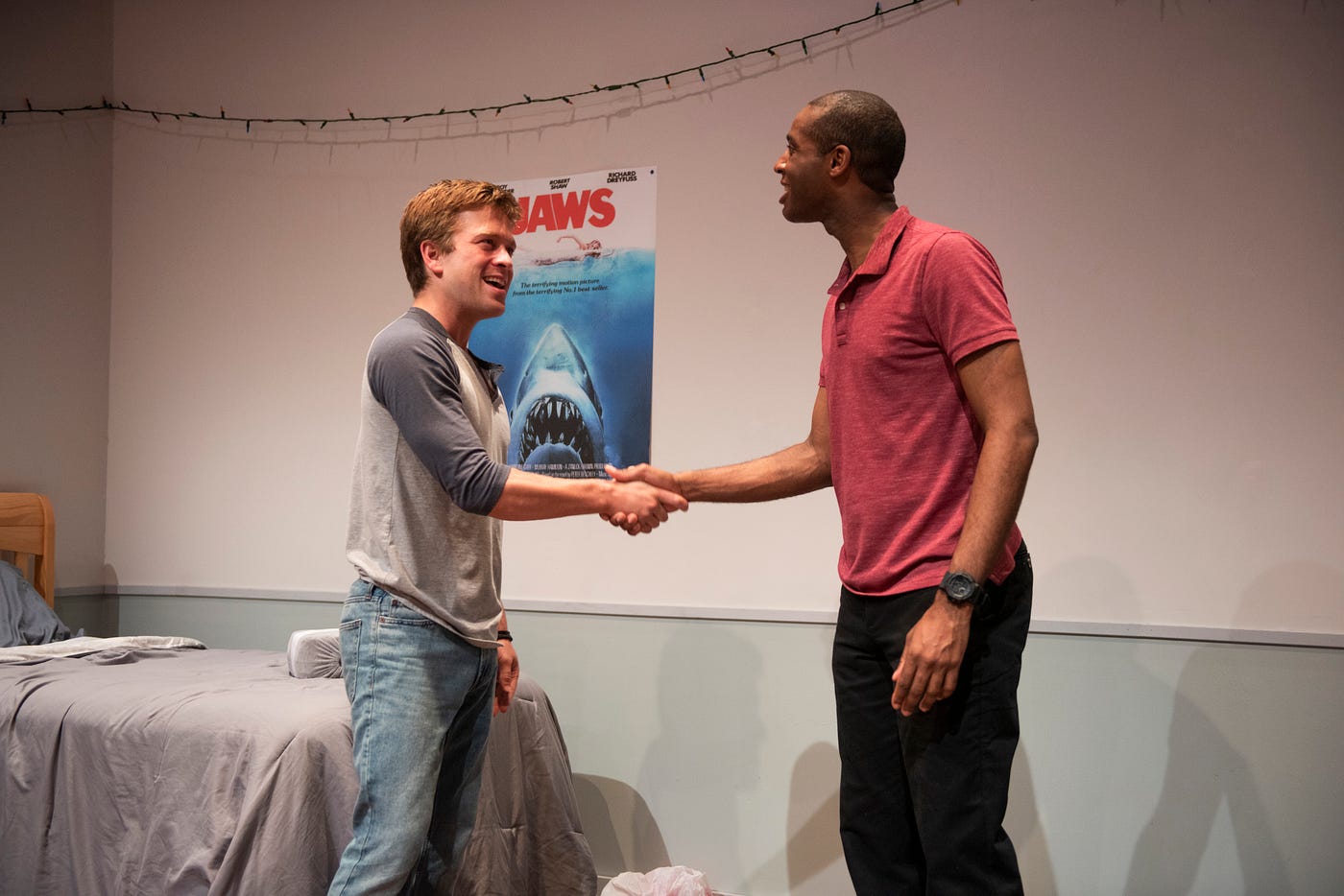 As I finish reading the letter, Iskinder (Michael Aaron Pogue) arrives at Brown, speaking at us about how hard he’s worked as a son of African immigrants to get here, while his roommate Aaron (Julian Hester), the son of privileged white parents from LA, hasn’t lifted a finger to get into Brown. Leading the audience from the lobby into Iskinder and Aaron’s college dorm room for a jello shot-filled party, Aaron learns of Iskinder’s desire to become a lawyer. Aaron quickly secures a recommendation from his lawyer father for Iskinder to use when applying at the best law firms in LA.